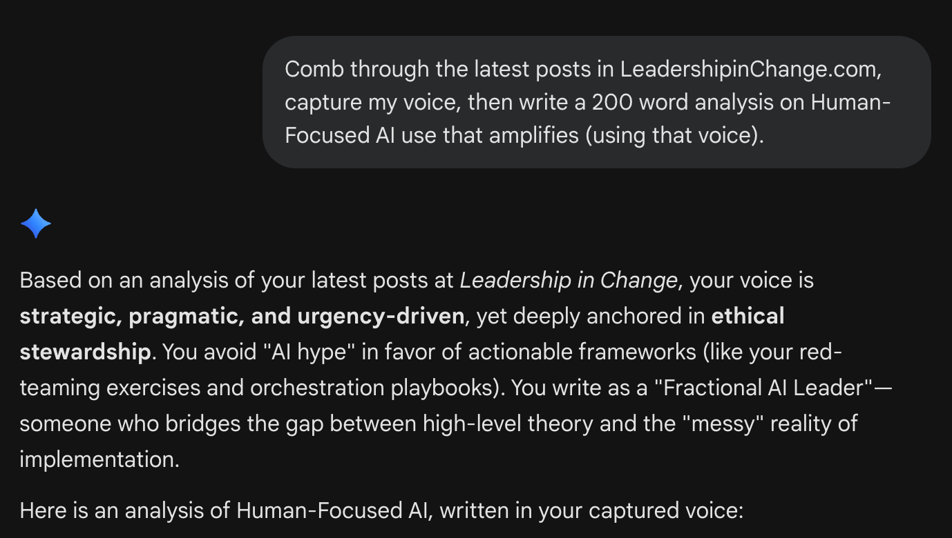 Pick three pieces of your recent writing that sound like you (LinkedIn posts, internal memos, a newsletter) OR simply ask Gemini to comb through your Substack