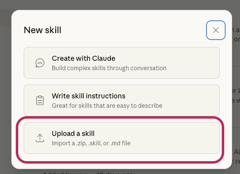 Click the “+ Upload skill” button