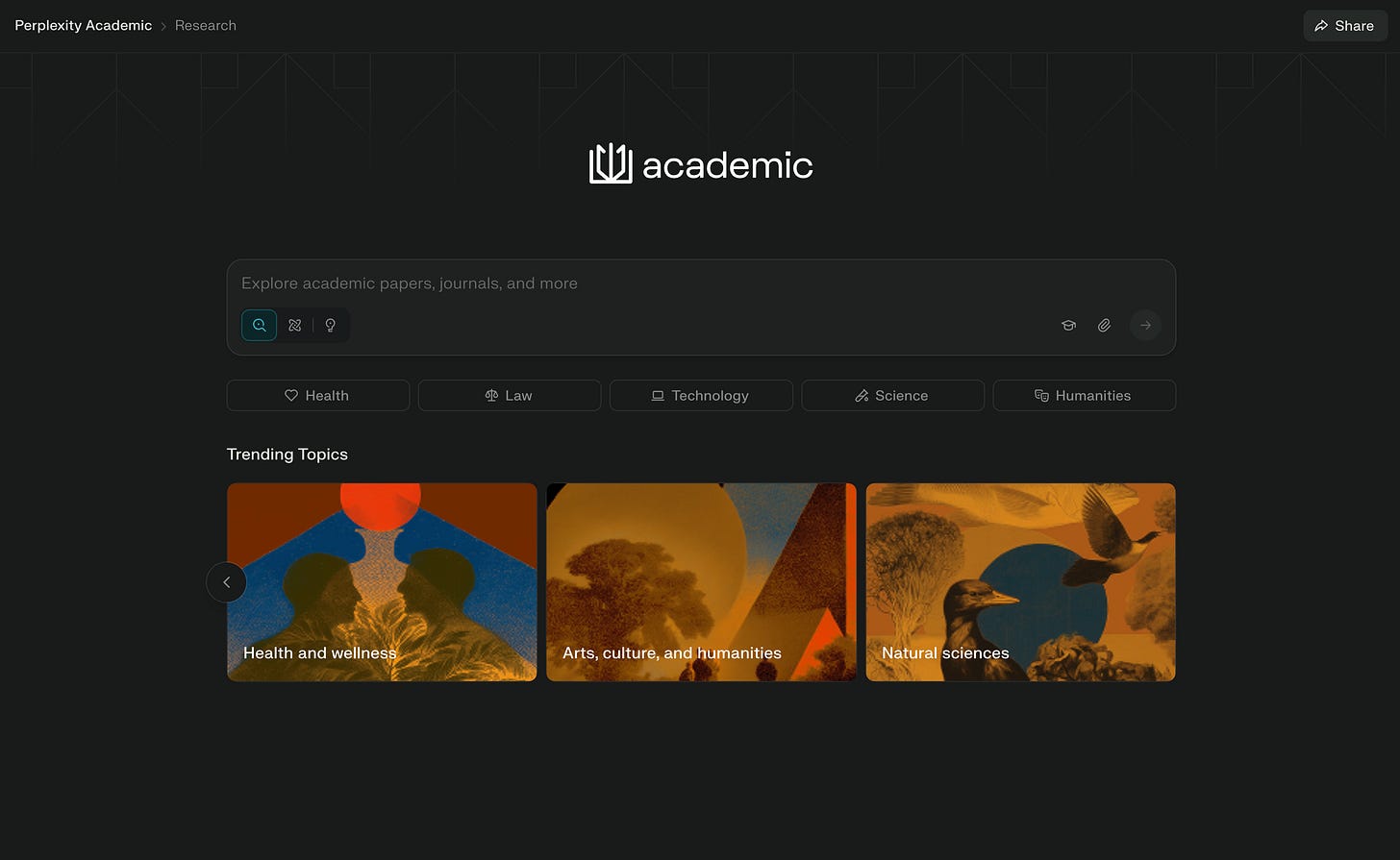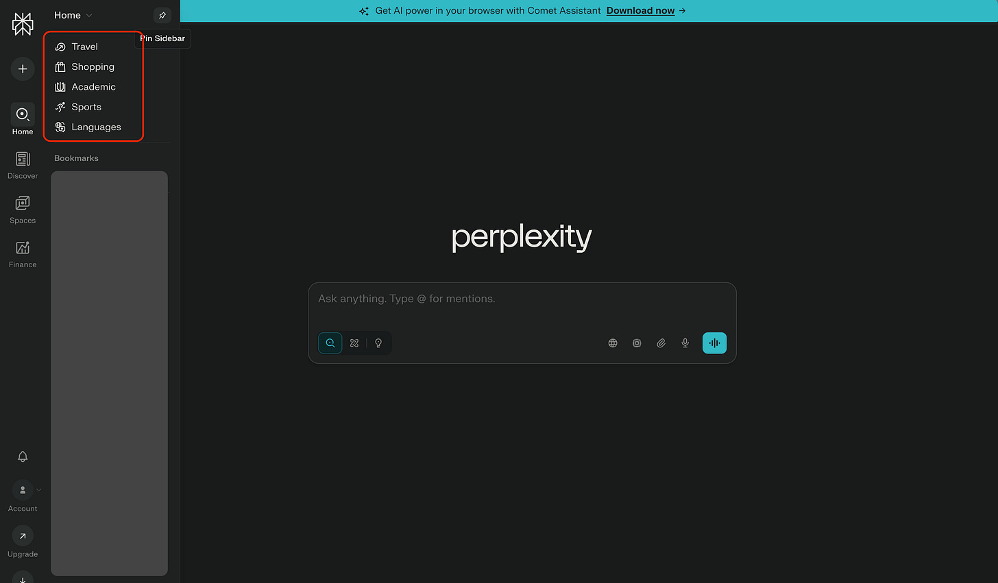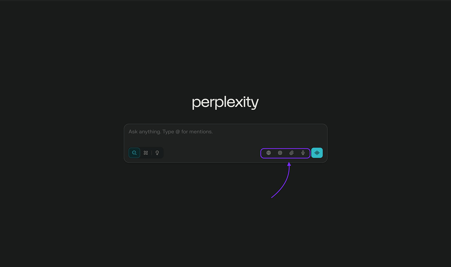 See those icons next to the search bar to the right? Those are Perplexity’s specialized search modes, and they completely change the quality of answers you get.