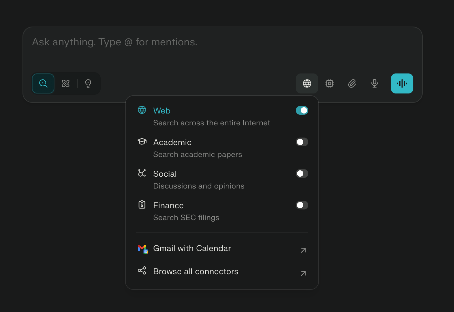 Perplexity is a unified AI research platform that combines real-time web search with AI reasoning to give you accurate, cited answers to any question.