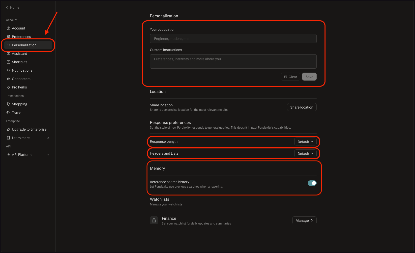 - Memory: toggle “Reference search history” on, and Perplexity uses your previous searches when answering