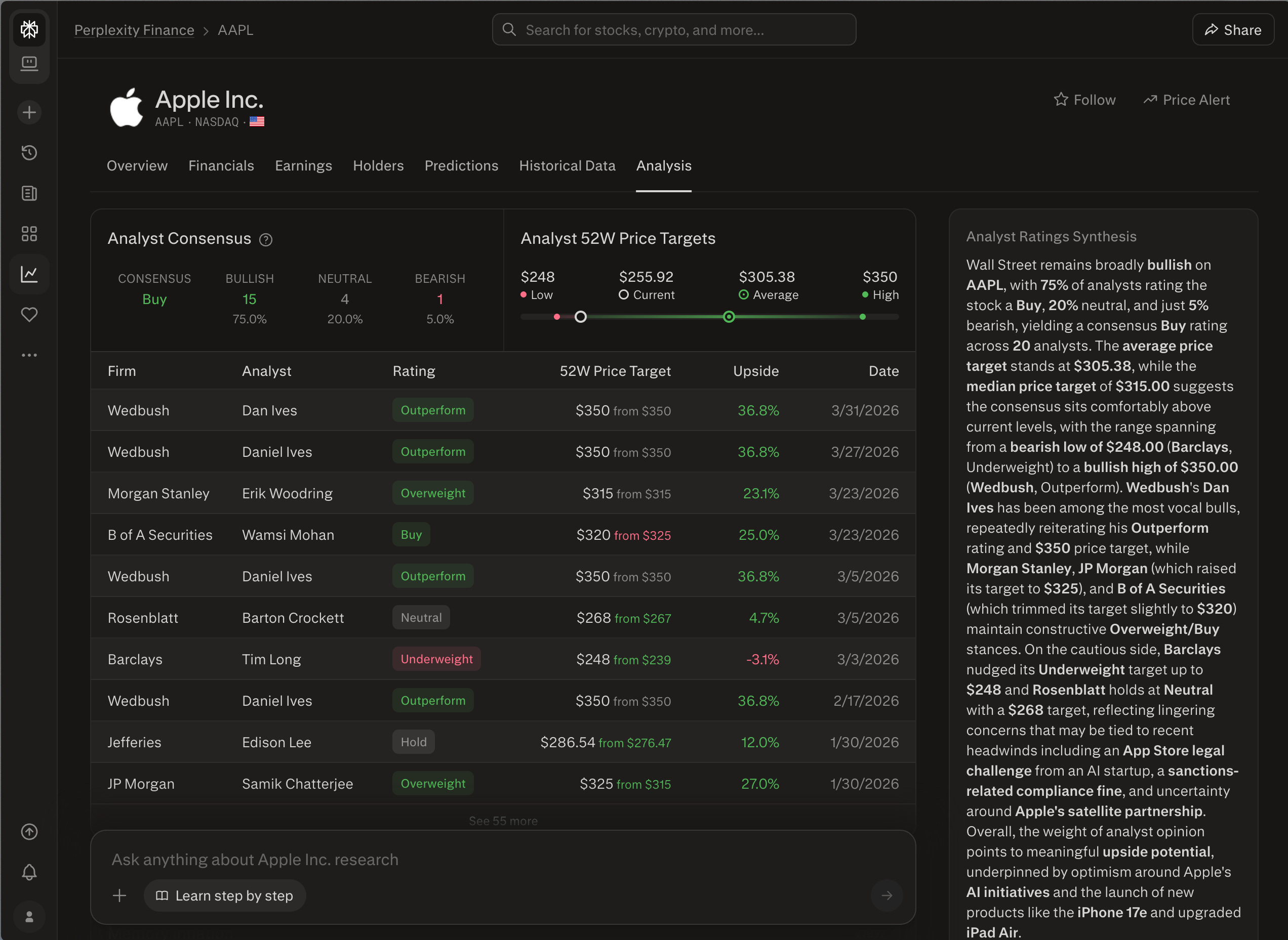 Every equity page now shows analyst consensus ratings with the 52-week target range and a synthesis that factors in the most recent news. Useful for quickly calibrating whether a price move reflects a fundamental shift or short-term noise before you spend more time on it.