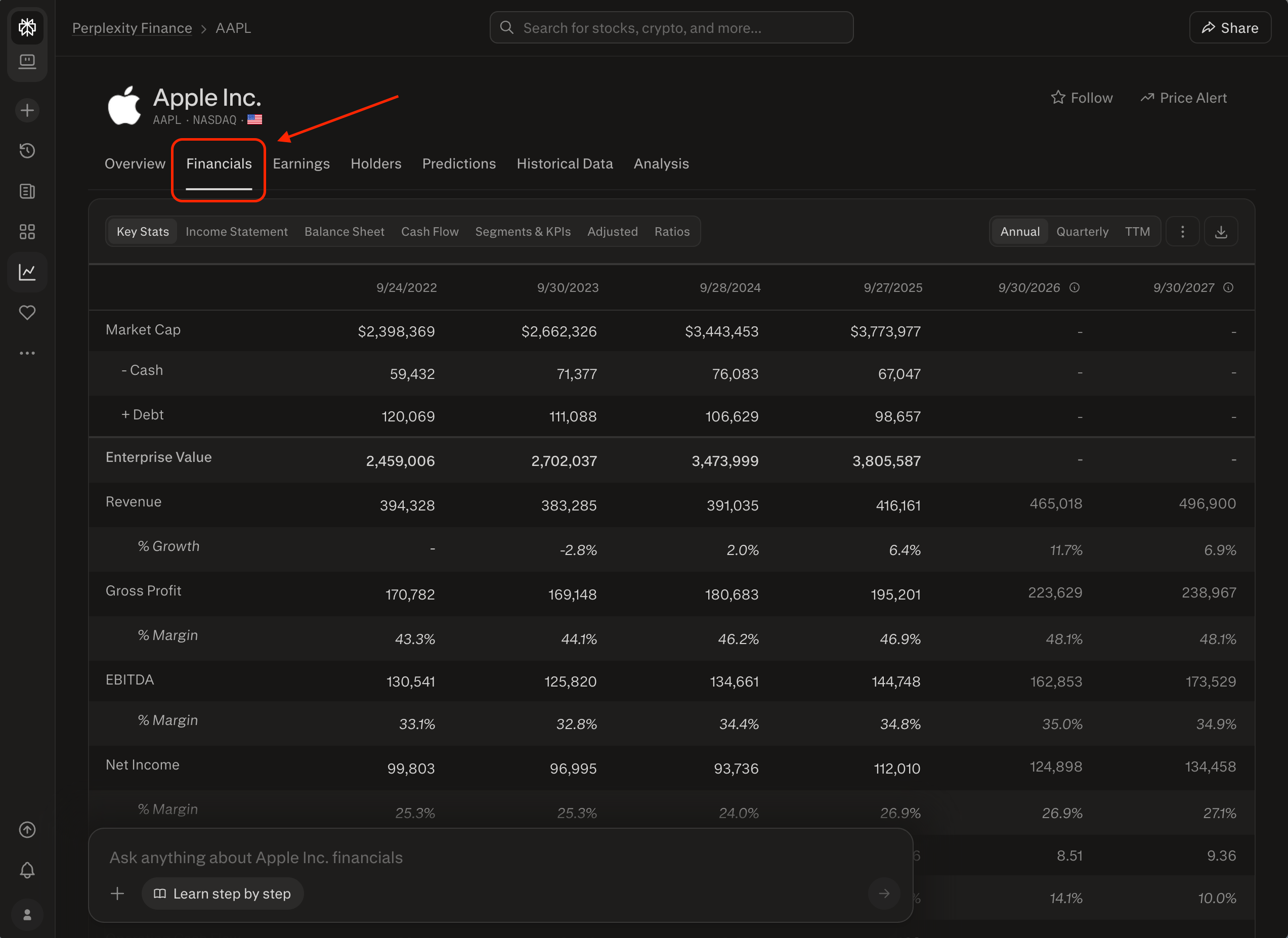3. Open any equity page in Perplexity Finance and explore the Financials tab with the SEC drill-down.