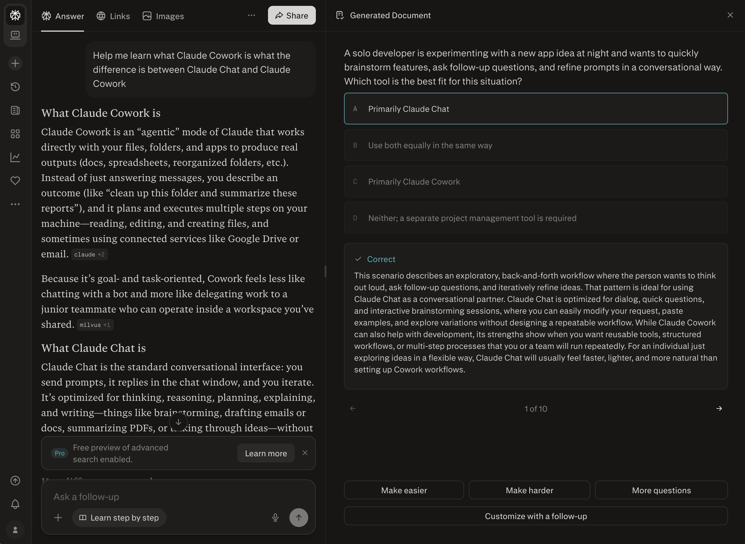 Instead of getting a direct answer, Perplexity walks you through a topic with questions, hints, and scaffolded explanations tailored to your level (you can set it up).