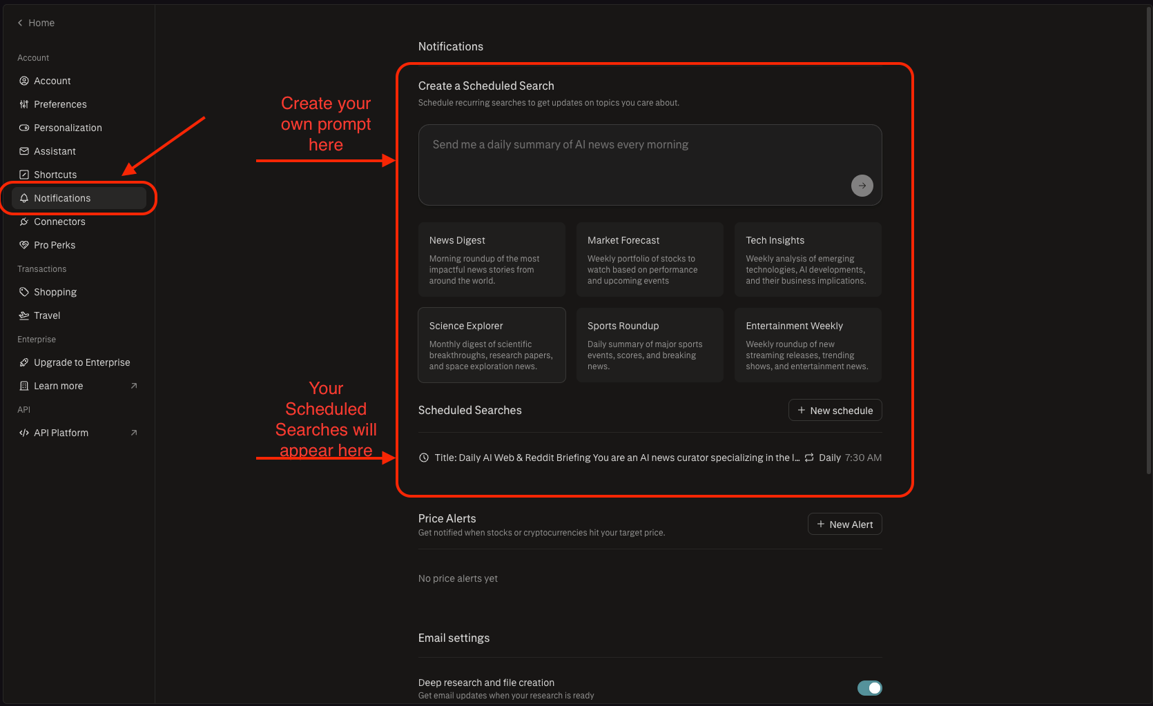 2. Create a new scheduled search - enter your prompt, set frequency, toggle notifications