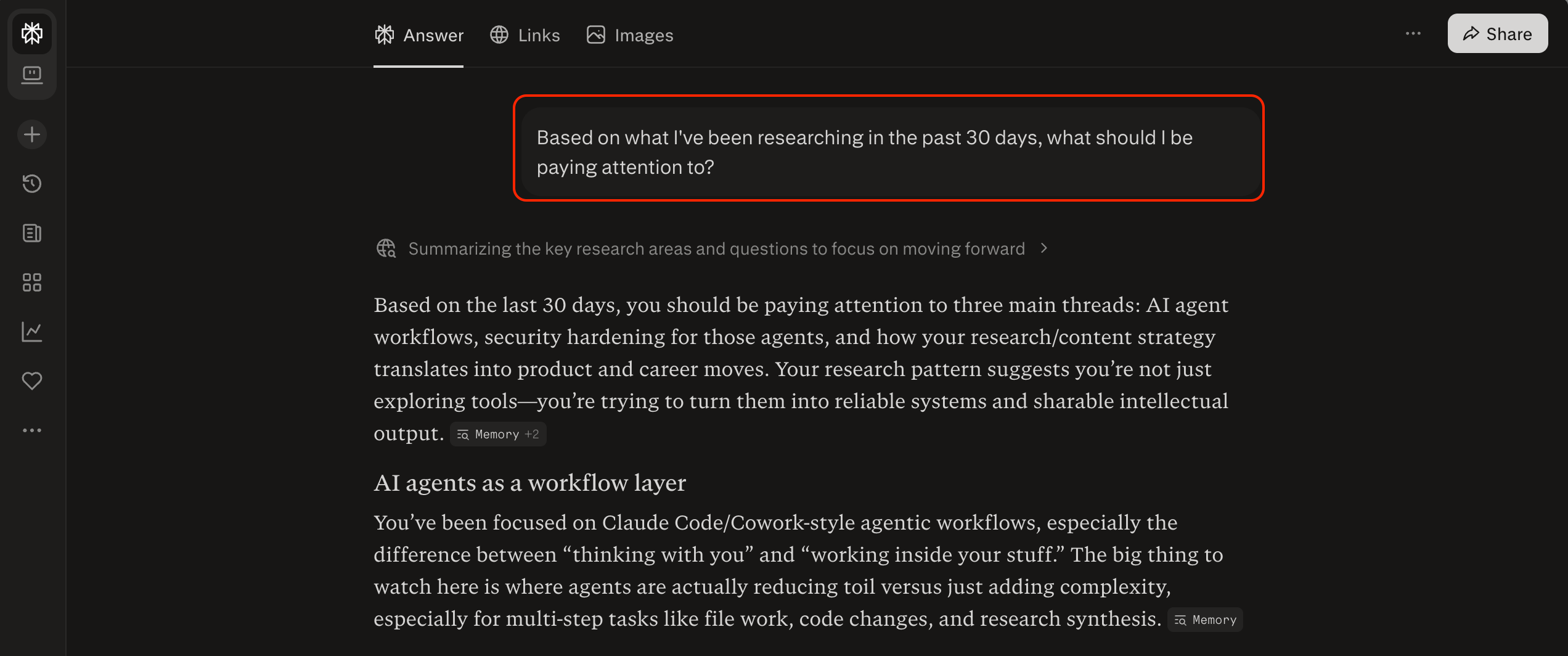 Prompt to try: “Based on what I’ve been researching in the past 30 days, what should I be paying attention to?”