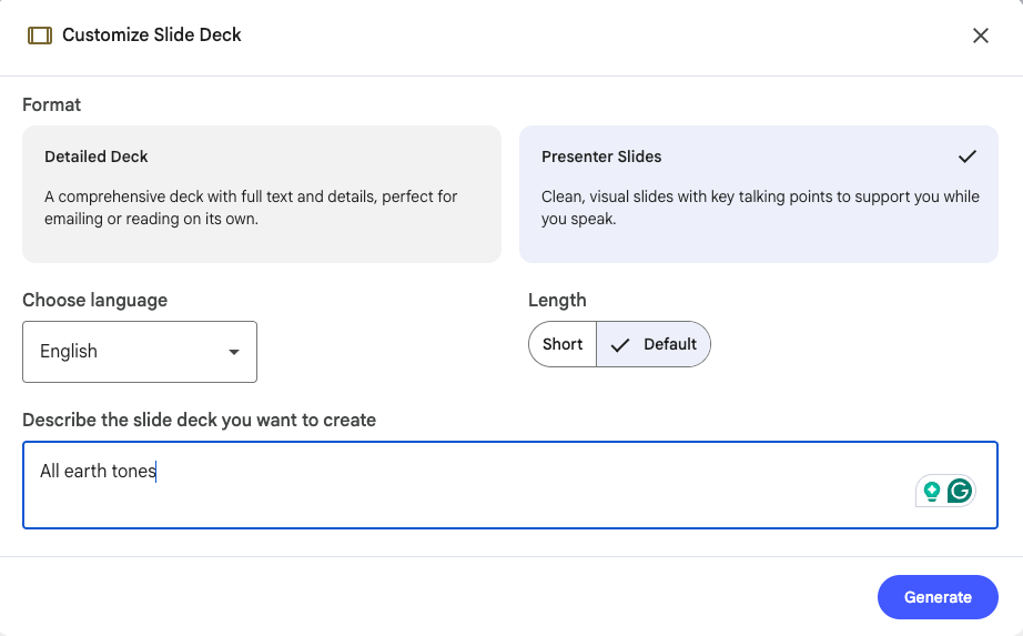 I chose concise presenter slides because I needed them for a briefing. Then I added a simple customization detail: All Earth Tones.