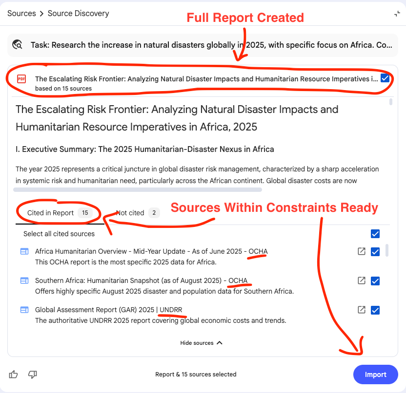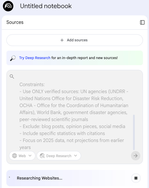 NotebookLM’s Deep Research flips this completely. You define which sources matter. You specify “only UN agencies, government reports, and peer-reviewed journals.” You exclude blog posts, opinion pieces, and unverified claims.