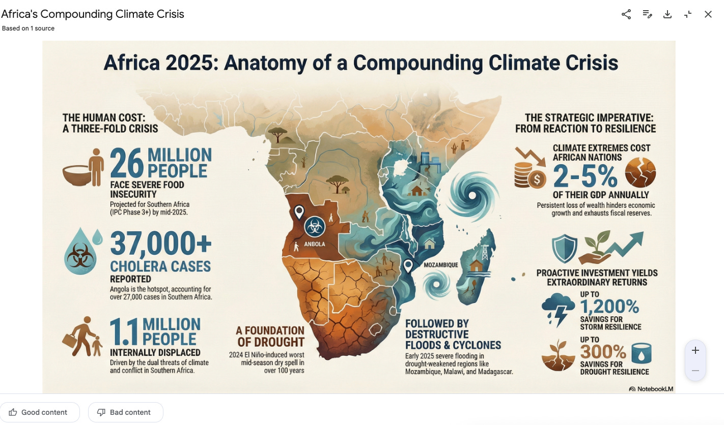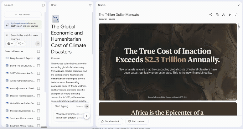 Orientation: Landscape (for presentations) Detail level: Detailed (I wanted comprehensive data visible) Custom description: “Create an infographic showing 2025 natural disaster impact in Africa. Use a map-based layout with statistics by disaster type (floods, droughts, storms, wildfires). Highlight the 40% increase in flood events in East Africa. Use earth tones and blues. Make the data immediately scannable for humanitarian decision-makers.”What NotebookLM generated: