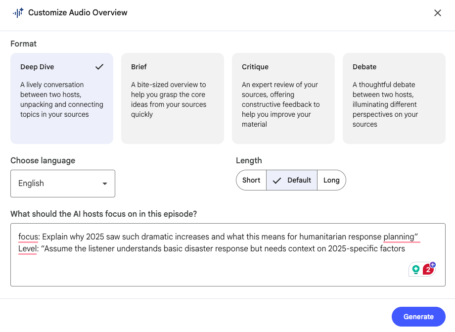 Focus: Explain why 2025 saw such dramatic increases and what this means for humanitarian response planning” Level: “Assume the listener understands basic disaster response but needs context on 2025-specific factorsWhat NotebookLM created was a full podcast where two hosts discussed: