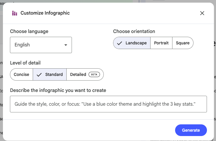 Then I look at what I got and decide what format I need next. Presenting to stakeholders? Generate slides. Sharing on social? Create an infographic. Learning while walking? Audio overview.