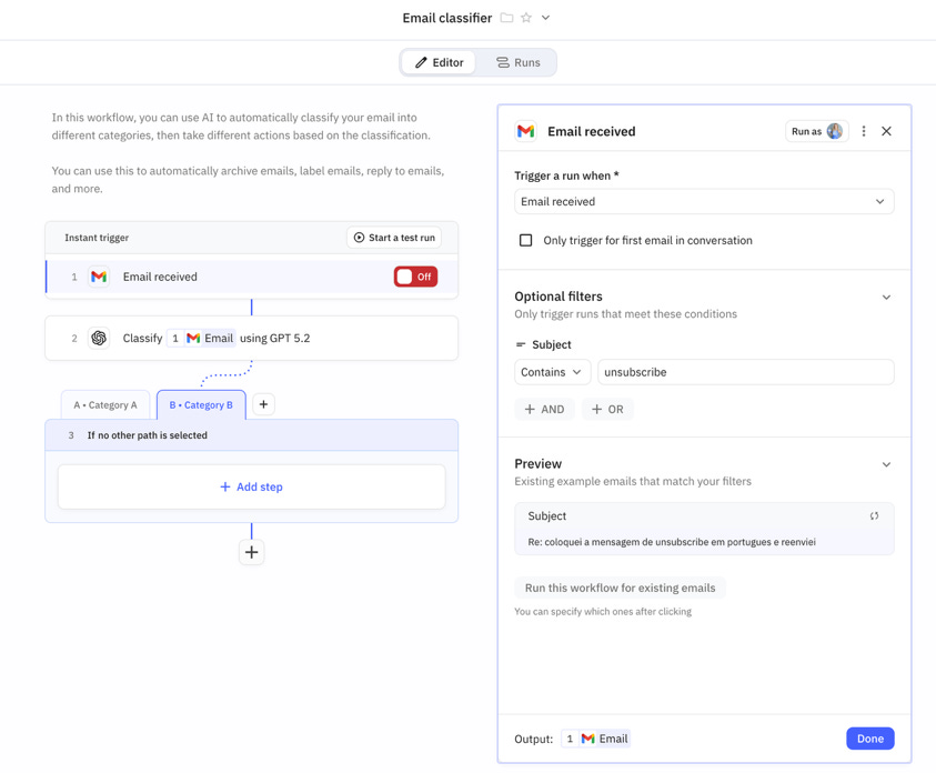 Run 10 actual emails through the system and compare the agent’s decisions to what you would have done. Adjust the AI prompt until the categories and routing feel consistent.