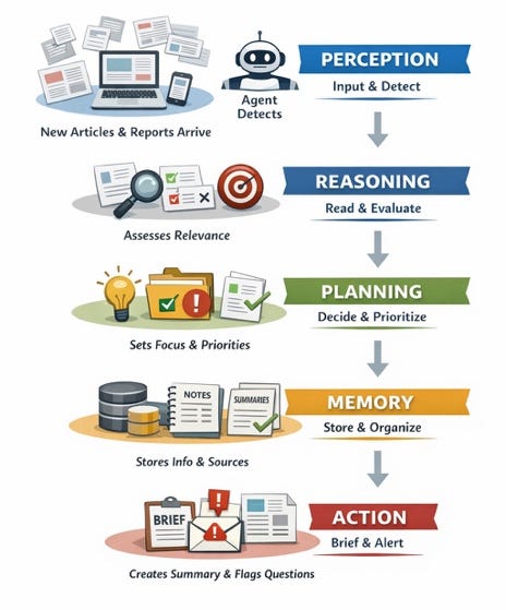Inside every agent, five things are working together. The agent perceives what is happening (an email arrives, a form is submitted). It reasons about what the situation means. It plans a sequence of steps. It remembers relevant context. And it takes action, sending a message, updating a record, routing a request. When any one of these pieces is missing or weak, agents feel unreliable. When they work together, agents feel almost like a dependable team member.