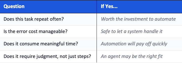 If you answer yes to most of them, you have a candidate worth building. If most answers are no, a simpler automation, or even doing nothing, is probably the smarter call.