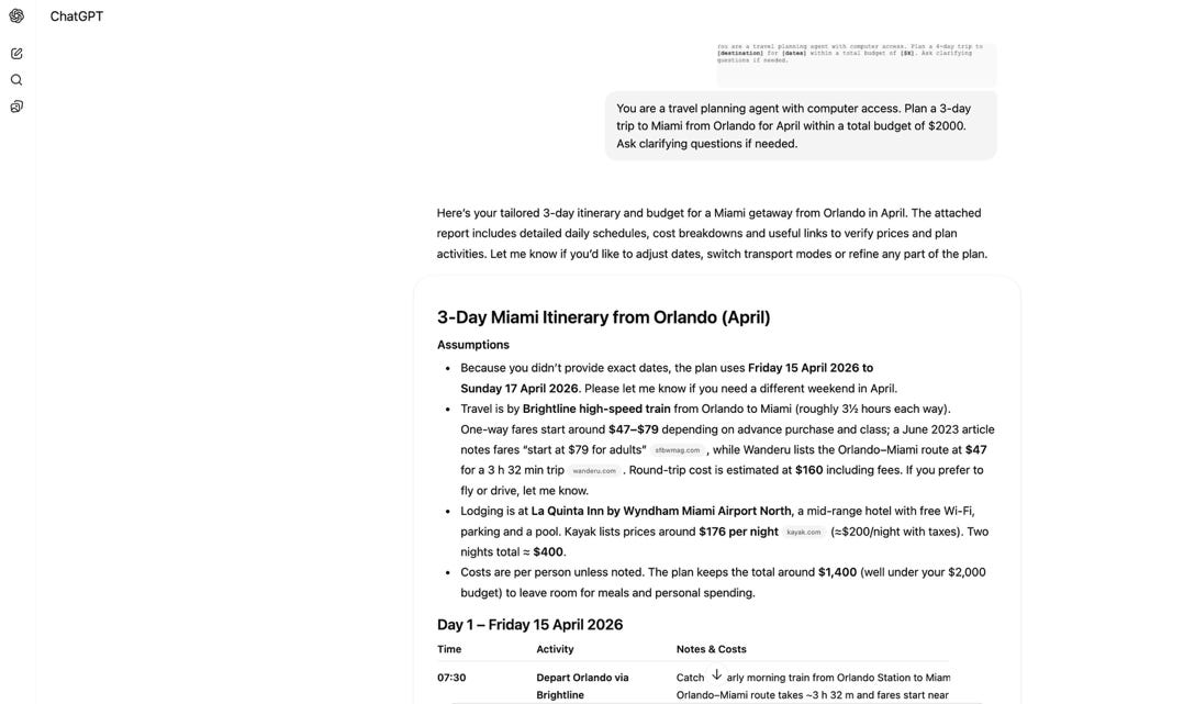 Ask clarifying questions if needed.It will use the browser to check websites and prices. You can add more details about flights, the origin airport, the category of hotels, and things to avoid. The more information you give to the agent, the better the results will be.