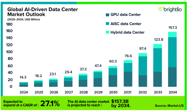 The AI data center market will grow from $14.3B in 2024 to $157.3B by 2034 (271% growth rate)