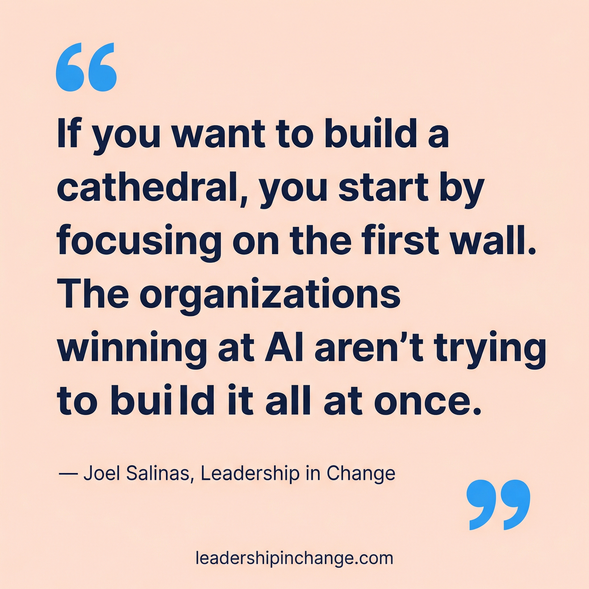Build the cathedral one wall at a time. The organizations winning at AI in 2026 are the ones that picked one process, proved the win, and built from there, not the ones trying to transform everything at once.