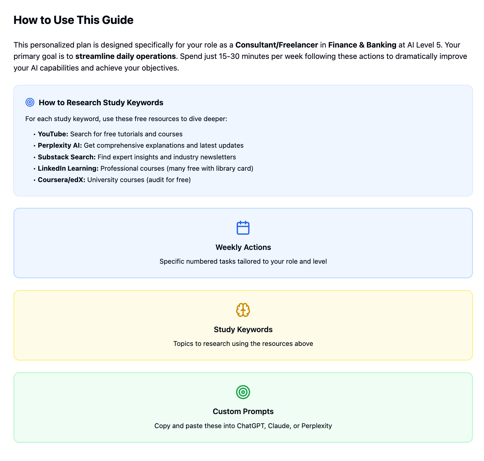 It guides you through a short reflection, then delivers a plan you can follow at your own pace, with learning themes, prompts, and next steps.