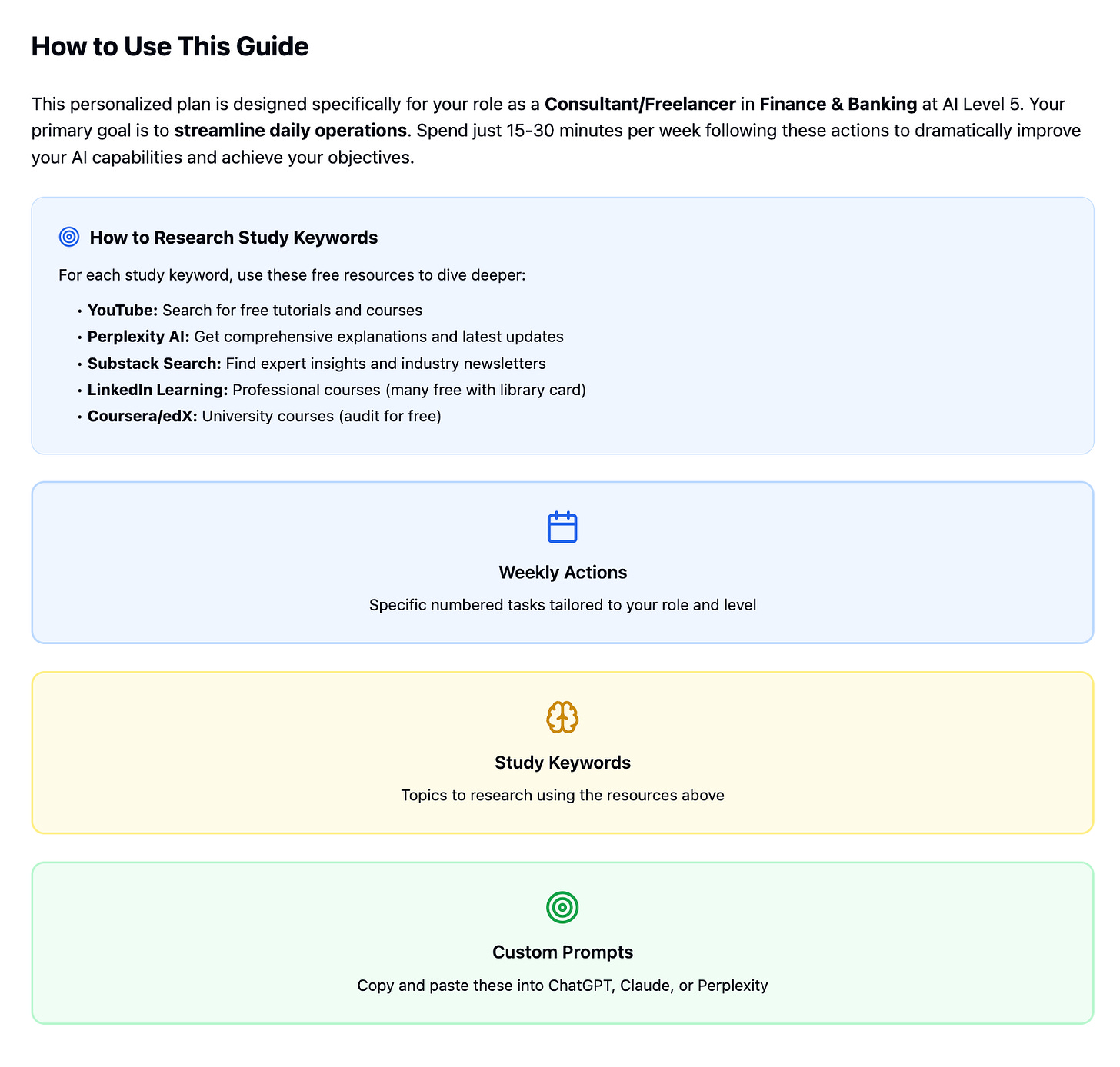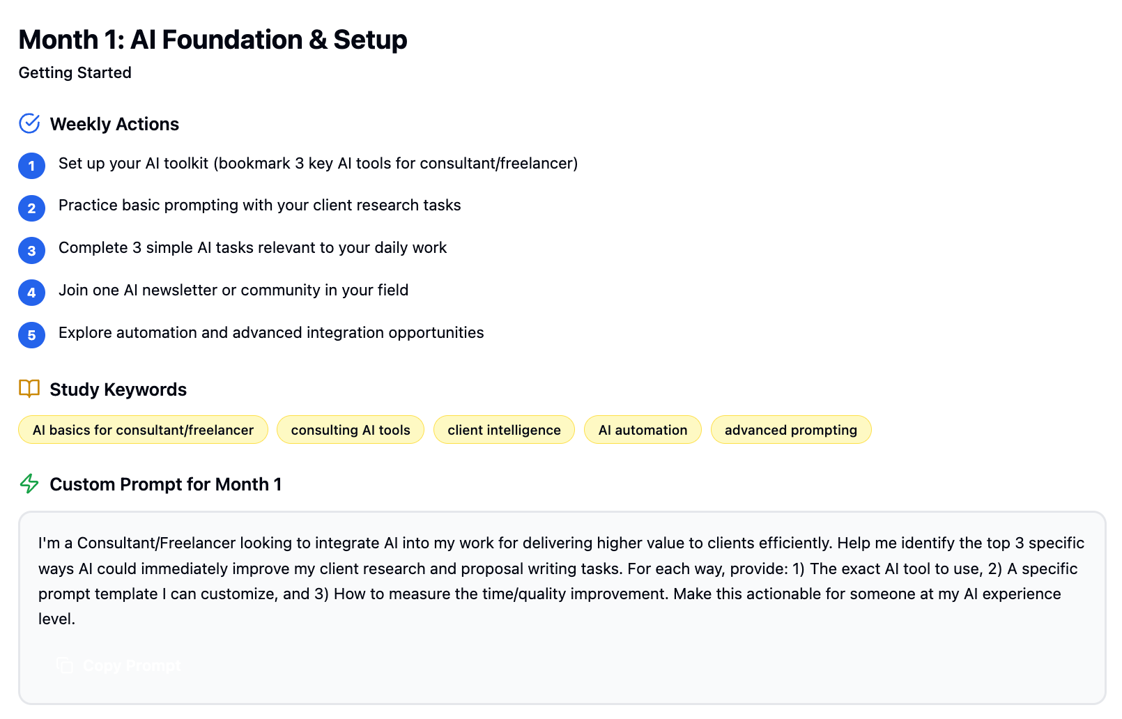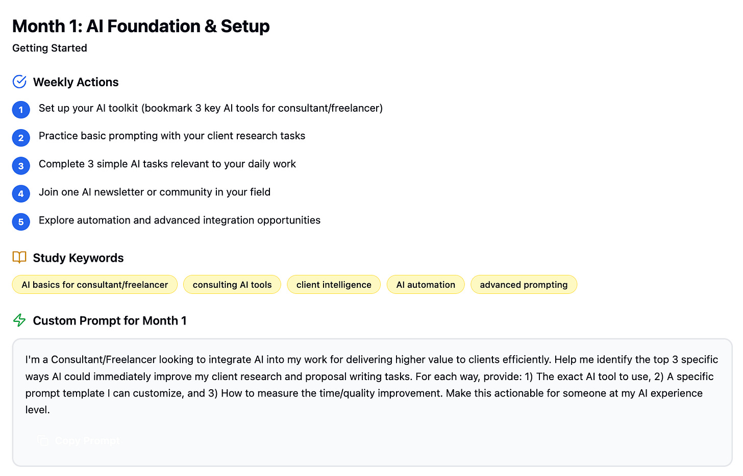 A structured Claude-powered free tool that creates a 6-month AI growth plan, tailored to: