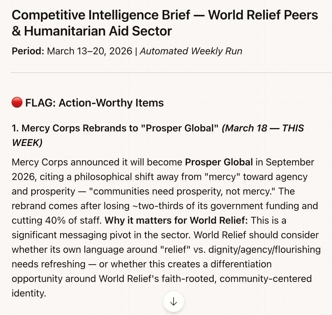 Starting the week informed about what’s happening in your space used to require a dedicated analyst or an expensive monitoring tool. Now it runs on a schedule while you sleep.