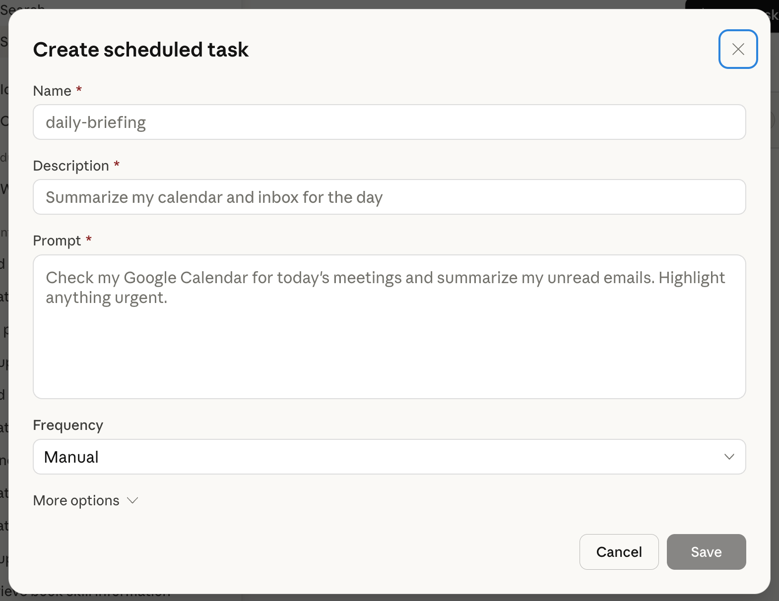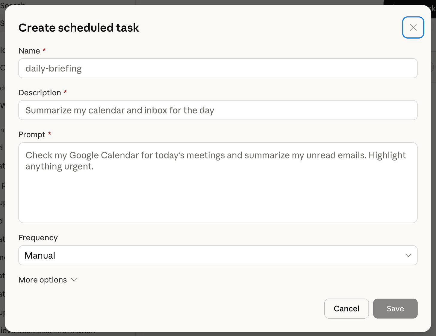 Here's what makes this different from ChatGPT's scheduling: Scheduled tasks have access to the same capabilities as regular Cowork tasks, including connected tools, skills, and installed plugins. That means you can build multi-step workflows, not just ask a single question. Your morning briefing can check your calendar AND summarize emails AND pull industry news in one task (This works when you've connected the relevant tools to Claude, like calendar or email integrations through “connectors”).