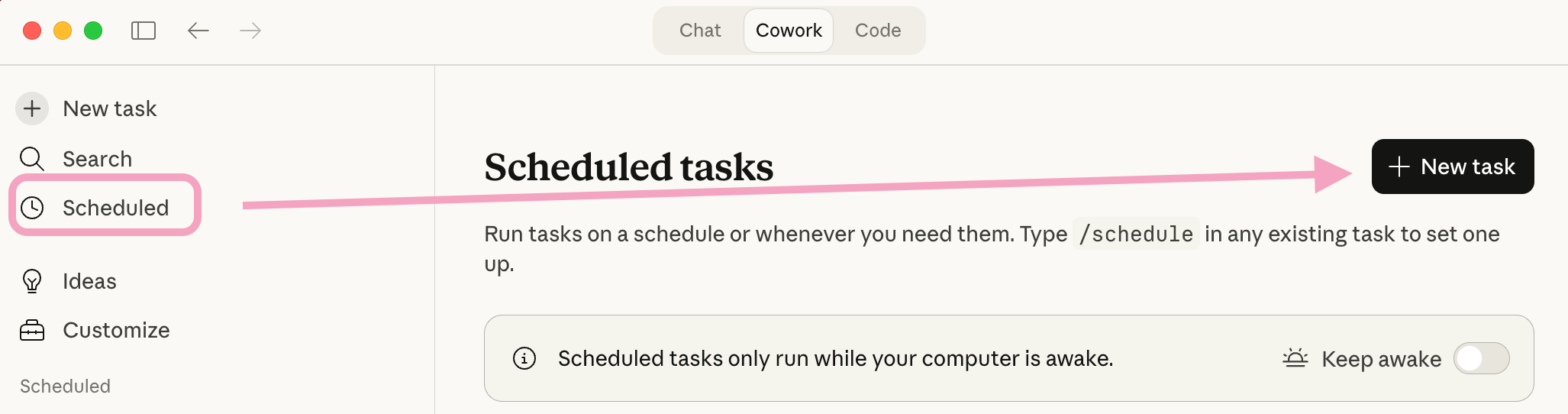 Step 1: Open the sidebar. In Claude Cowork, click Schedule in the left sidebar, then select + New Task.