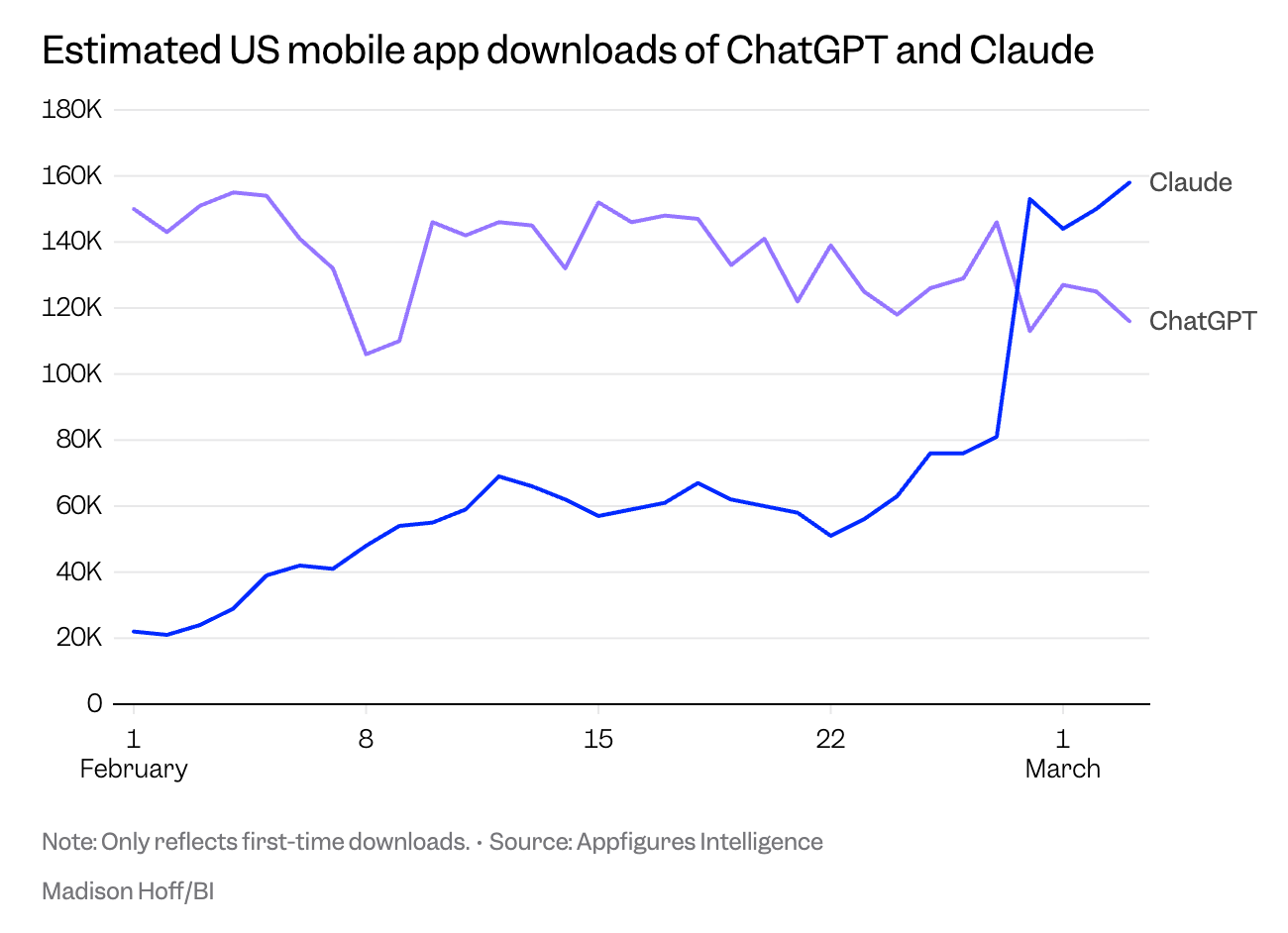 Appfigures Intelligence: U.S. Downloads of Claude and ChatGPT Mobile Apps, February 1 to March 2, 2026 (App Store & Google Play, estimated first-time downloads)