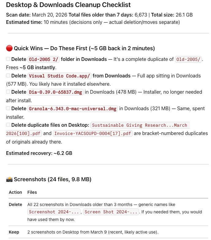 “Scan my Desktop and Downloads folders. List every file older than 7 days, grouped by type (screenshots, PDFs, documents, images, other). For each group, recommend which files to archive, which to delete, and which to keep. Give me the summary as a checklist I can work through in 10 minutes.”