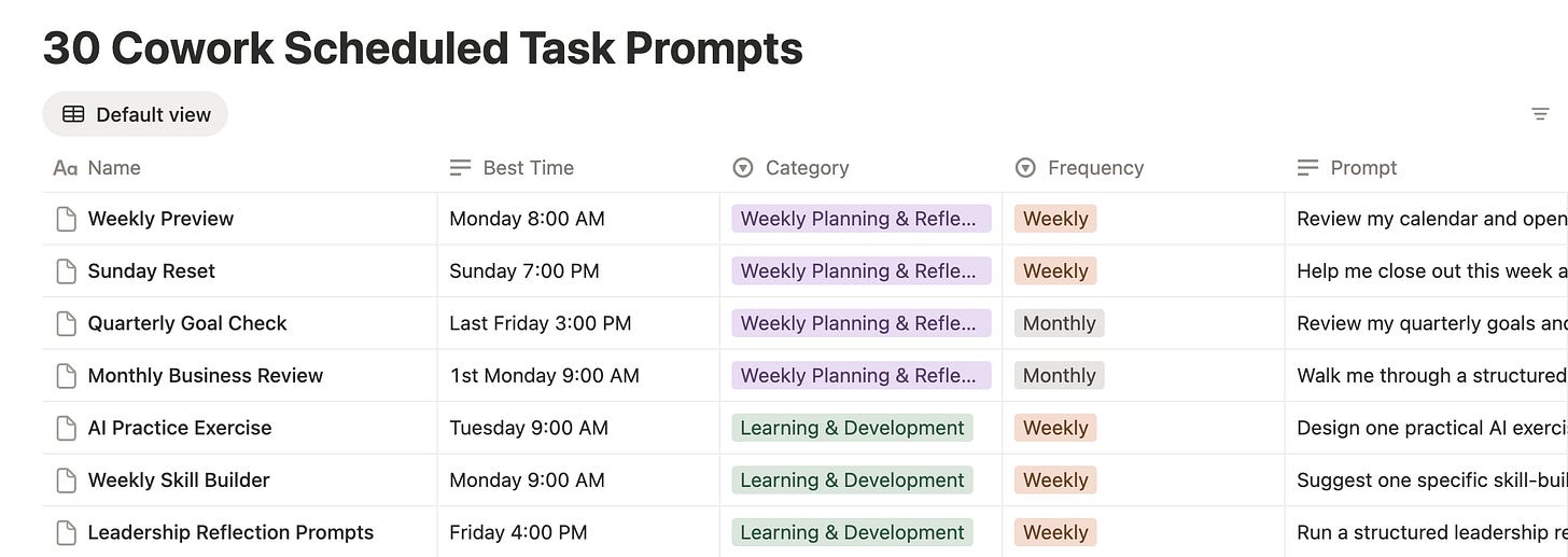 I built a filterable Notion dashboard with 30 copy-ready Cowork scheduled task prompts across 7 categories: