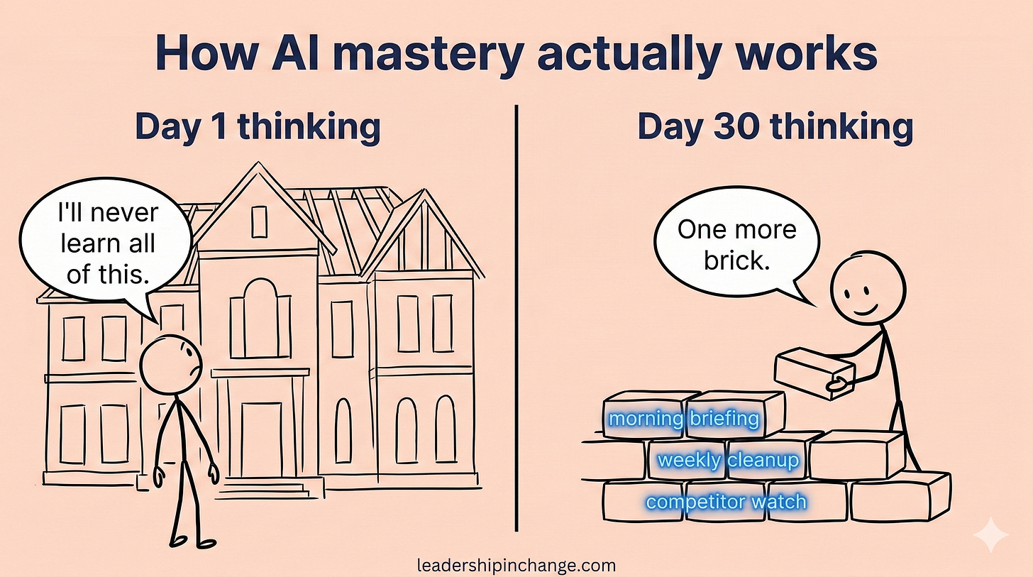 The leaders who actually get lasting value from AI aren’t the ones who tried to learn everything at once. They’re the ones who laid a few bricks every day. One prompt that worked. One workflow they automated. One habit they built on top of another.