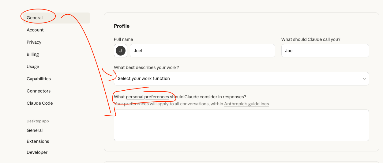 User Preferences (Claude’s term for your standing instructions across all conversations) tell AI how to work with you. Think of this as your permanent onboarding document.