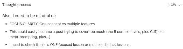 Here is an example of Claude using my context and thinking through pieces I never asked for in the prompt, but that are in the project instructions, to give me a better response: