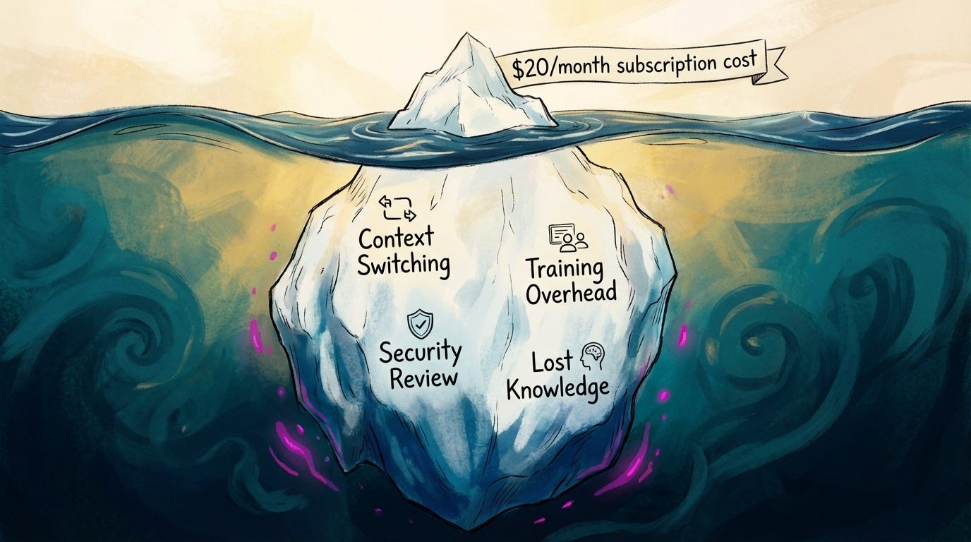 The real cost compounds invisibly - context-switching, decision fatigue, training overhead, lost knowledge. Those hidden taxes on your team’s focus cost more than every subscription combined.