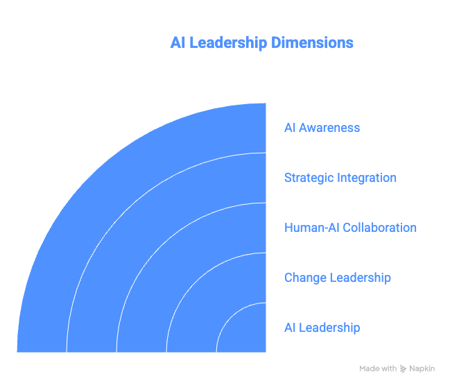 AI leadership spans five research-backed dimensions: AI Awareness (understanding capabilities and limits), Tool Proficiency (hands-on usage), Strategic Integration (using AI for decisions, not just tasks), Human-AI Collaboration (treating AI as a thinking partner), and Change Leadership (bringing your team along). Most leaders only develop one or two while neglecting the rest.