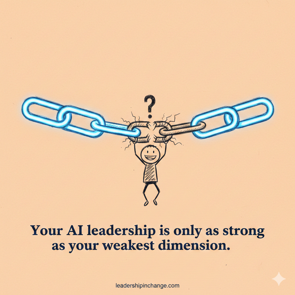 Think of it like a chain. A leader with strong tool proficiency but weak change leadership will build sophisticated AI workflows that their team never adopts. A leader with strong strategic vision but weak tool proficiency will see opportunities they can’t execute on. The gap doesn’t average out. It bottlenecks.