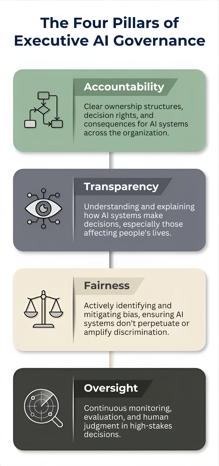 What are the four pillars of executive AI governance? The four pillars are accountability (clear ownership of AI systems), transparency (understanding how AI makes decisions), fairness (identifying and mitigating bias), and oversight (continuous monitoring with human judgment for high-stakes decisions). Together, they transform AI ethics from abstract principle into leadership competency.