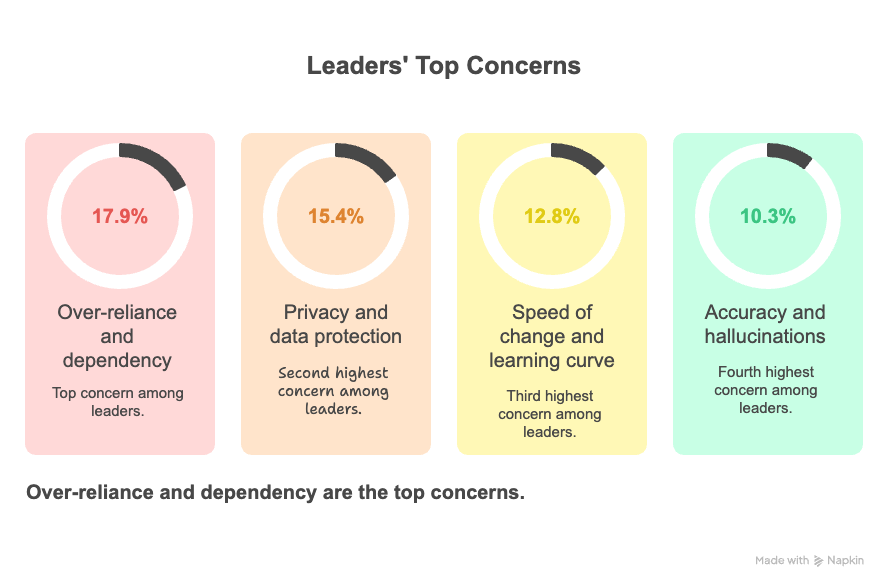 The most common barrier to AI adoption isn’t budget or access. It’s time, as we’ll see next (30% of leaders cite “time/capacity to learn and implement” as their biggest gap). But what concerns them most once they’re using it?