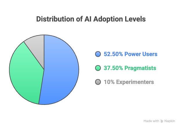 The final 10% are Experimenters. AI isn’t yet core to their work. They’re testing, learning, trying to figure out where it fits. Some are constrained by time. Others haven’t found their use case yet. They want to believe the hype, but they’re not seeing it in their daily reality.